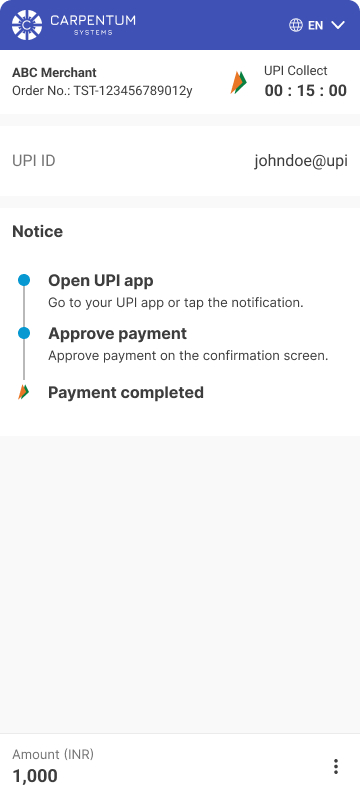 Customer is redirected to their online payment service to complete the payment using their UPI ID. |